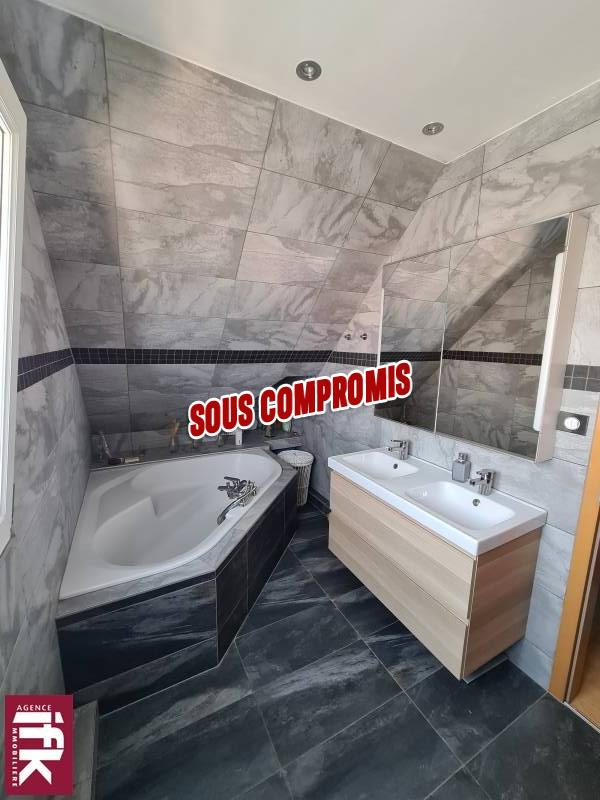 L’étage offre également une salle de bain avec baignoire, douche et meuble 2 vasques, avec radiateur sèche serviette.