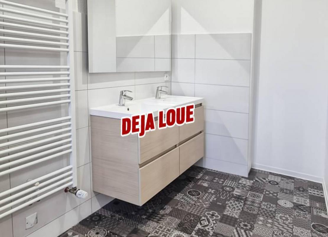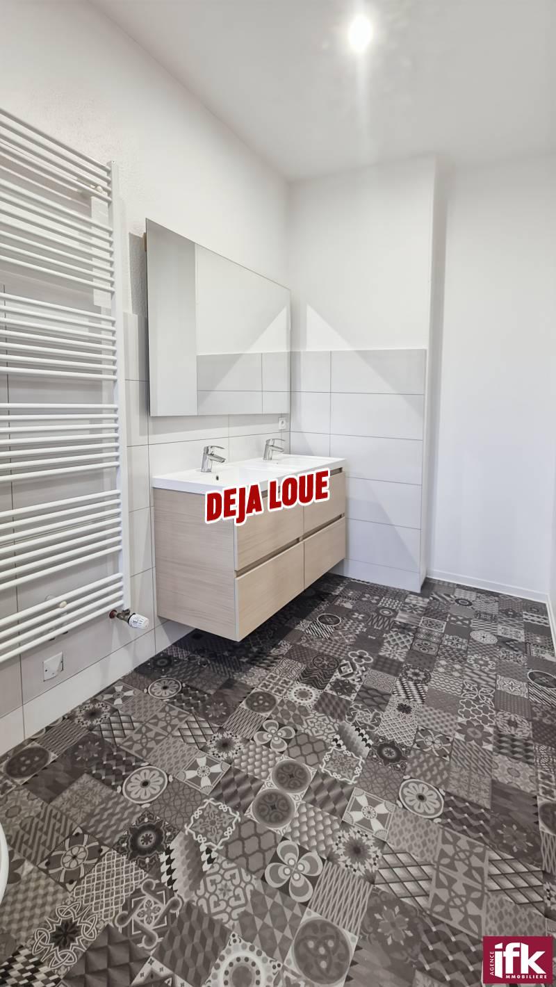 • Une salle de bain avec douche italienne, double meuble vasque, sèche-serviettes et WC.