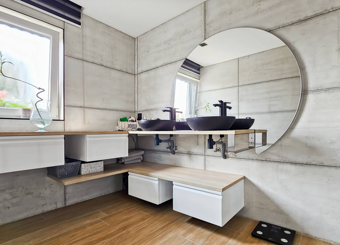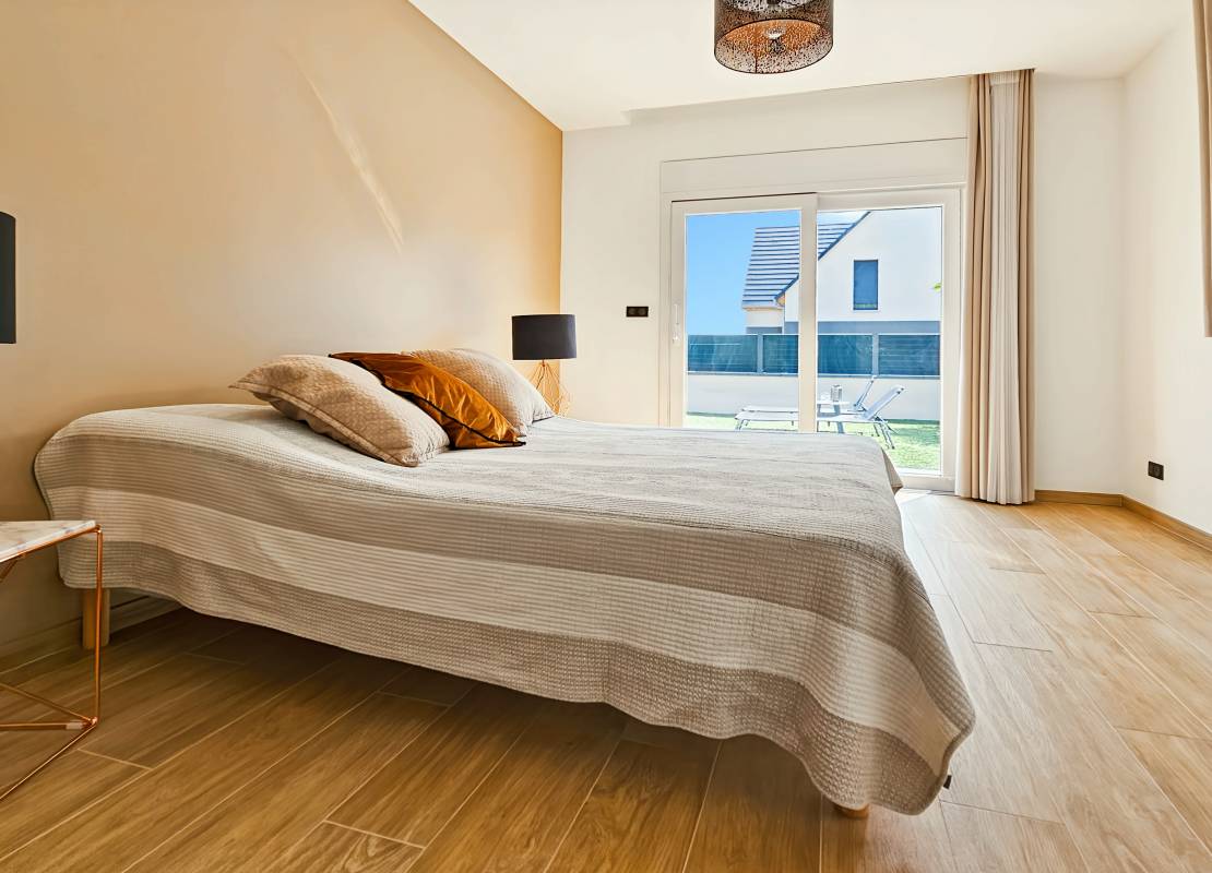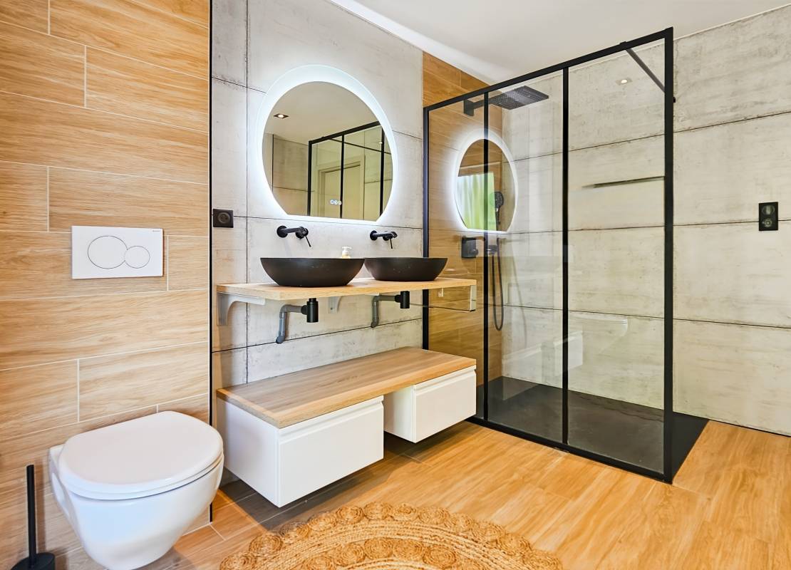 Le rez-de-chaussée accueille également une suite parentale avec dressing, salle d’eau et accès au jardin, ainsi que des toilettes séparées avec lave-mains.