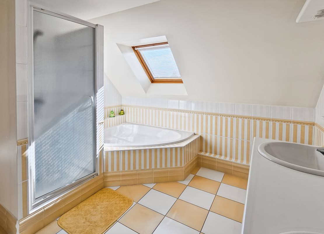 • Une salle de bains équipée d’une baignoire d’une douche et un toilette
