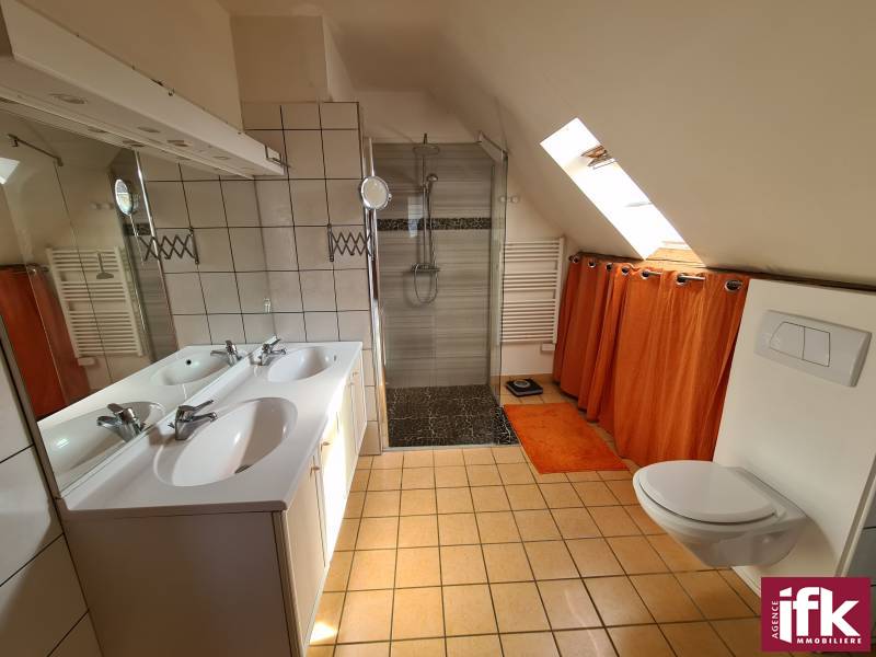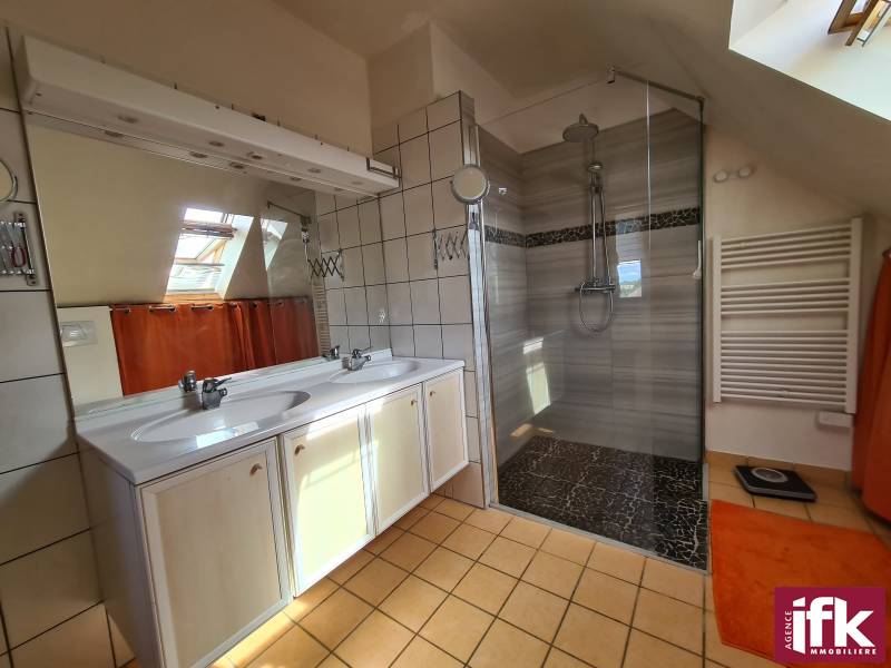 • 2ème étage : vaste salon/séjour lumineux, cuisine ouverte équipée, suite parentale avec salle de bain privative (baignoire, douche, meuble vasque, WC).