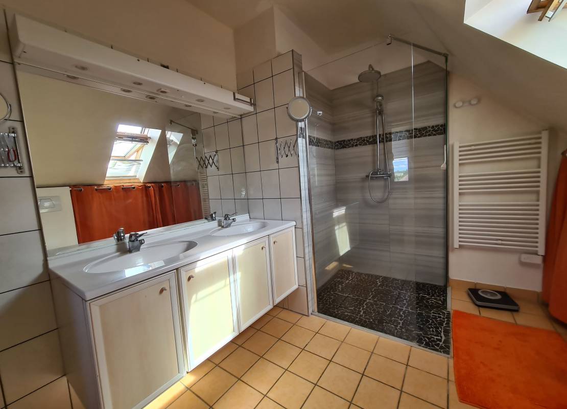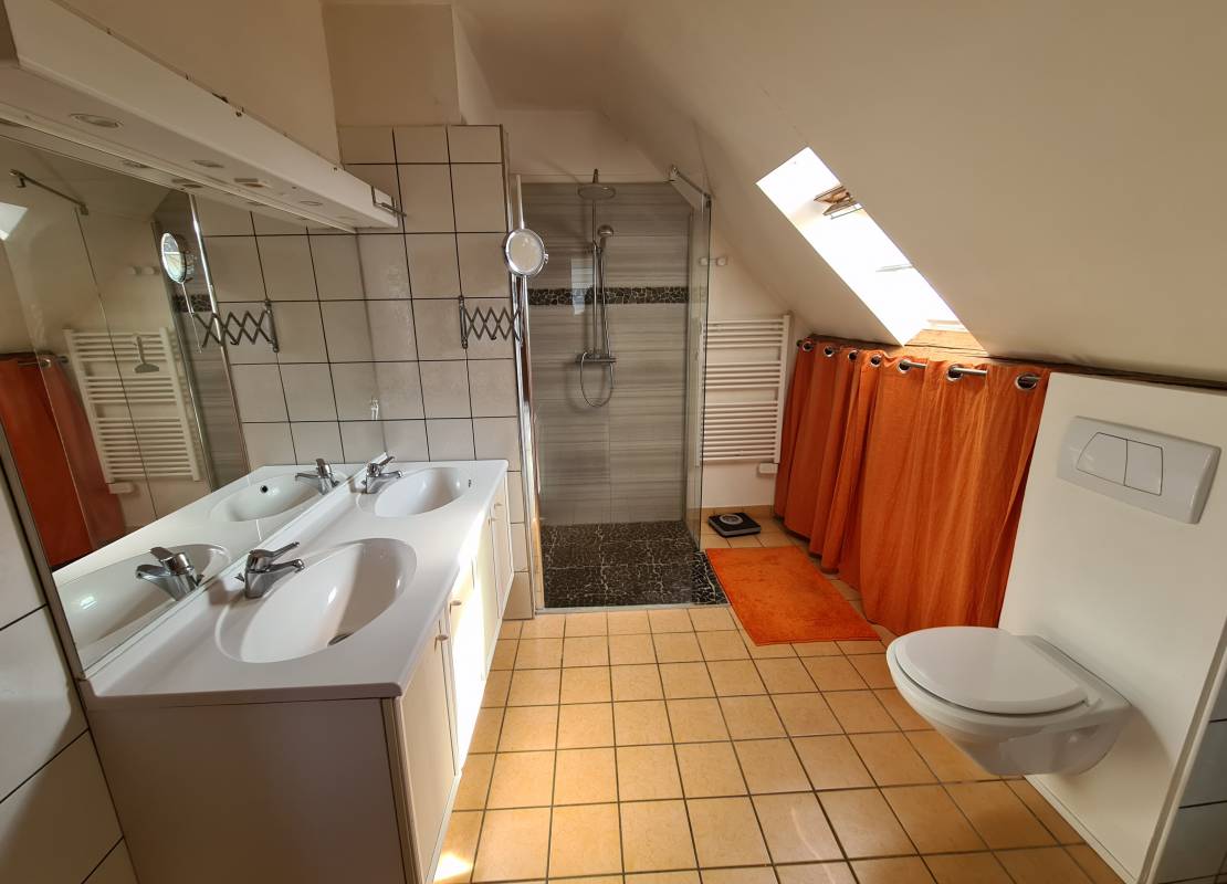 • 1er étage : 2 chambres confortables et salle d’eau avec douche, meuble vasque et WC.