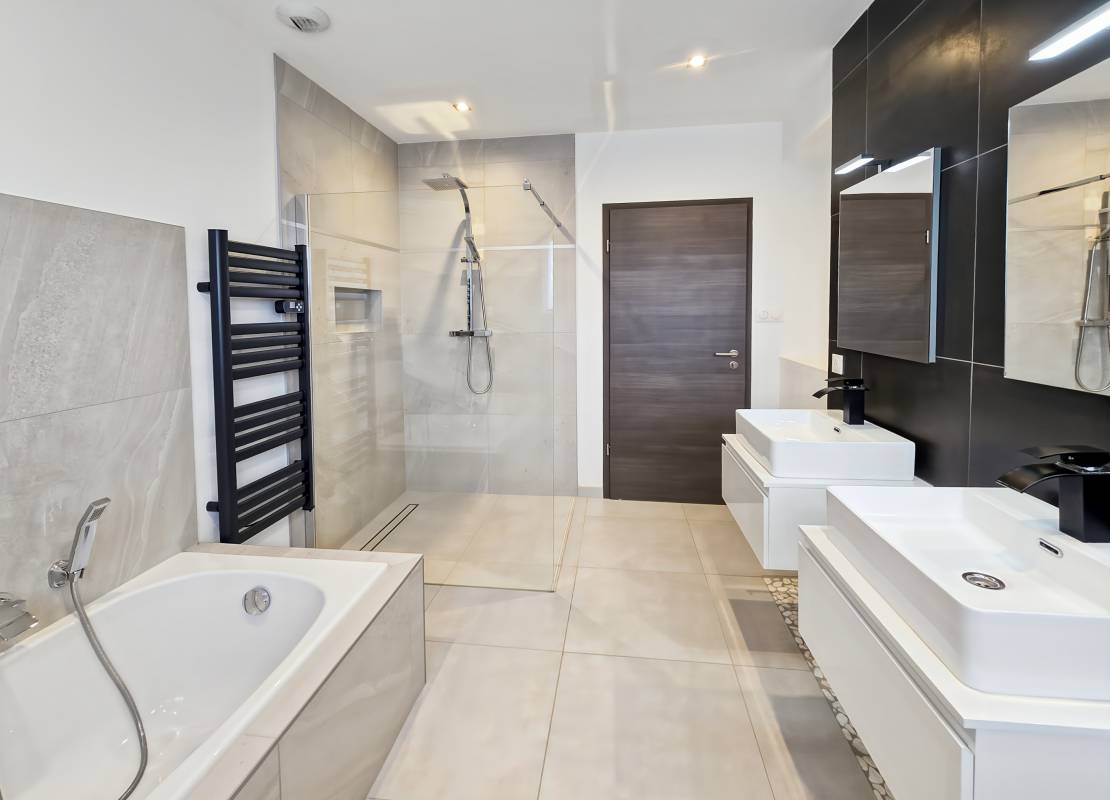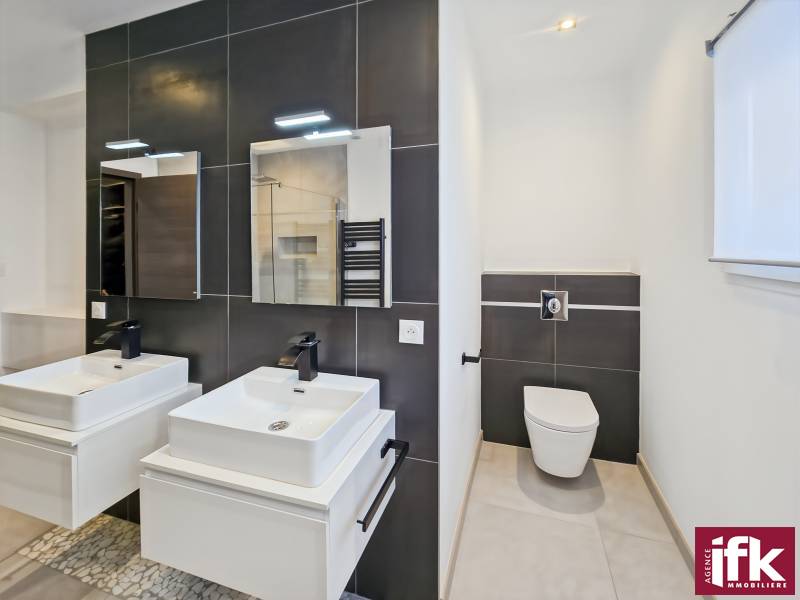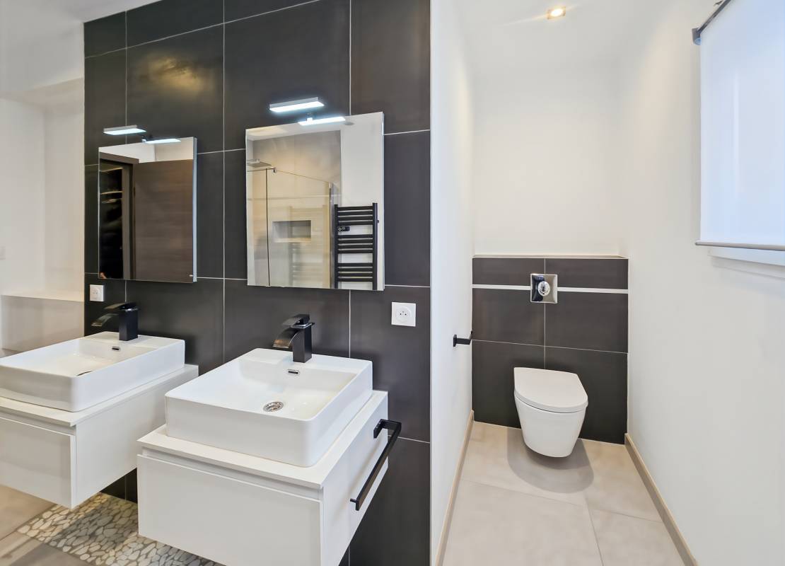 • une salle d’eau avec une douche, 2 vasques, un wc.