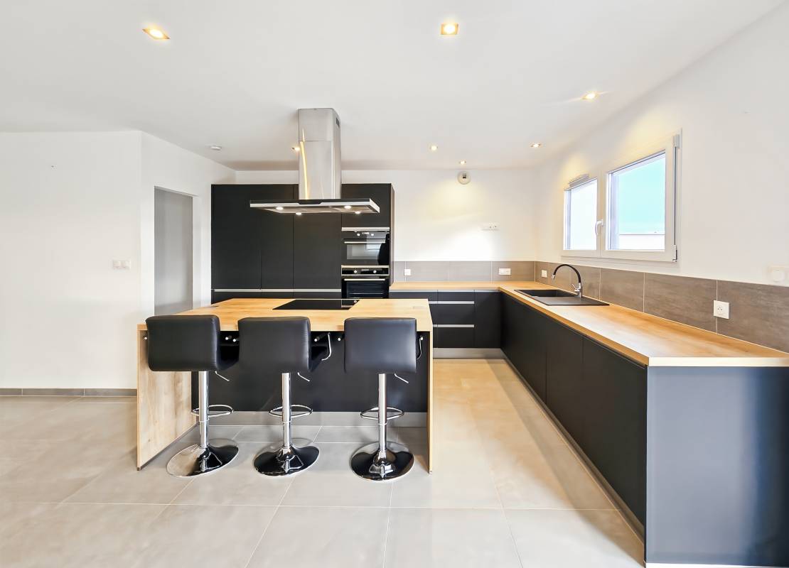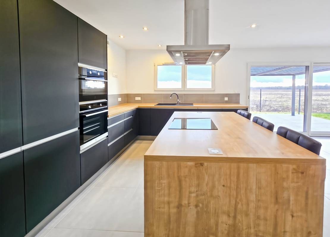 • Une cuisine moderne, ouverte et équipée de nombreux rangements, électro-ménager et îlot central,