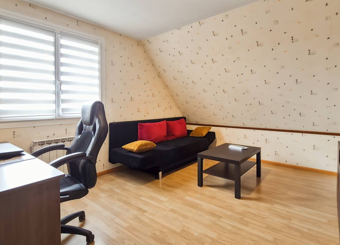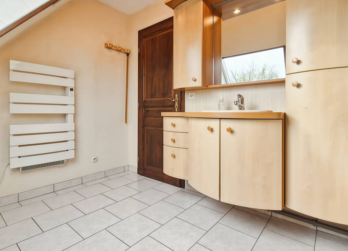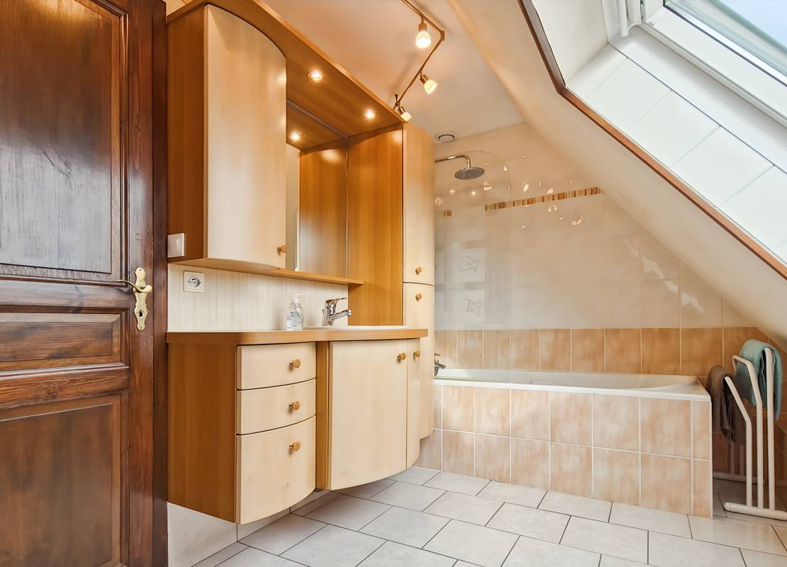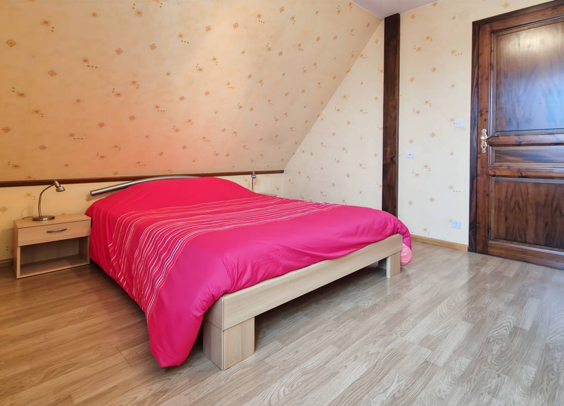 À l’étage : Trois chambres, dont deux d’environ 12 m² au sol et une d’environ 16 m² au sol, ainsi qu’une salle de bains.